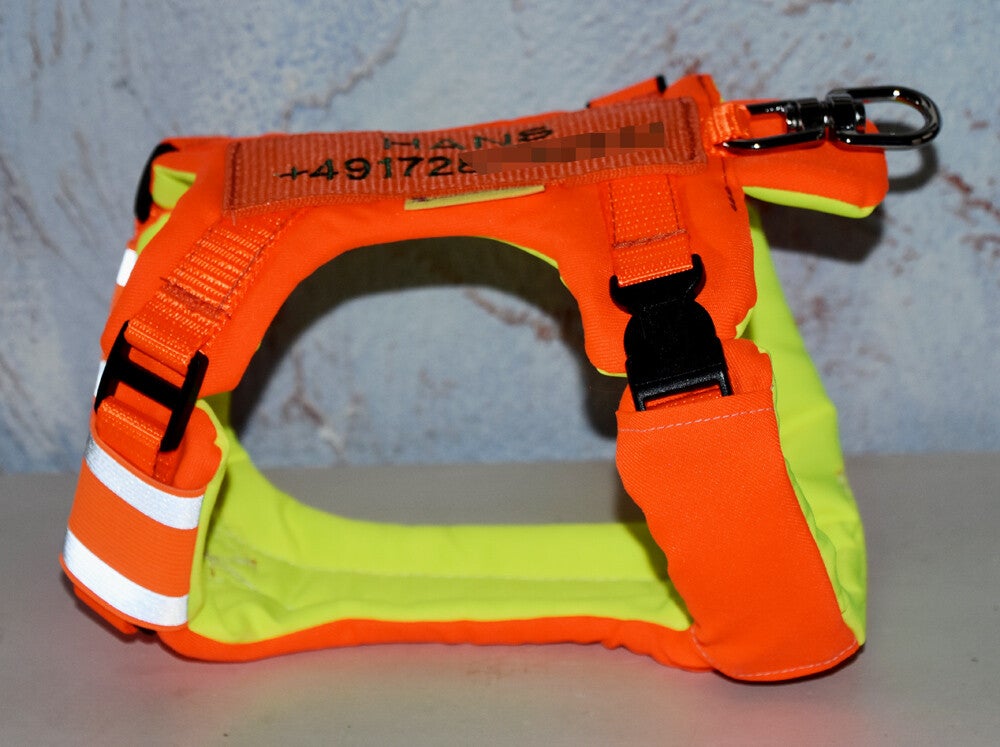 Auf Wunsch und gegen Aufpreis kann eine GPS-Tasche (für tractive) angebracht werden. Gerne sticke ich auch Namen und Telefonnummer ein. Dies ist im Preis inbegriffen.